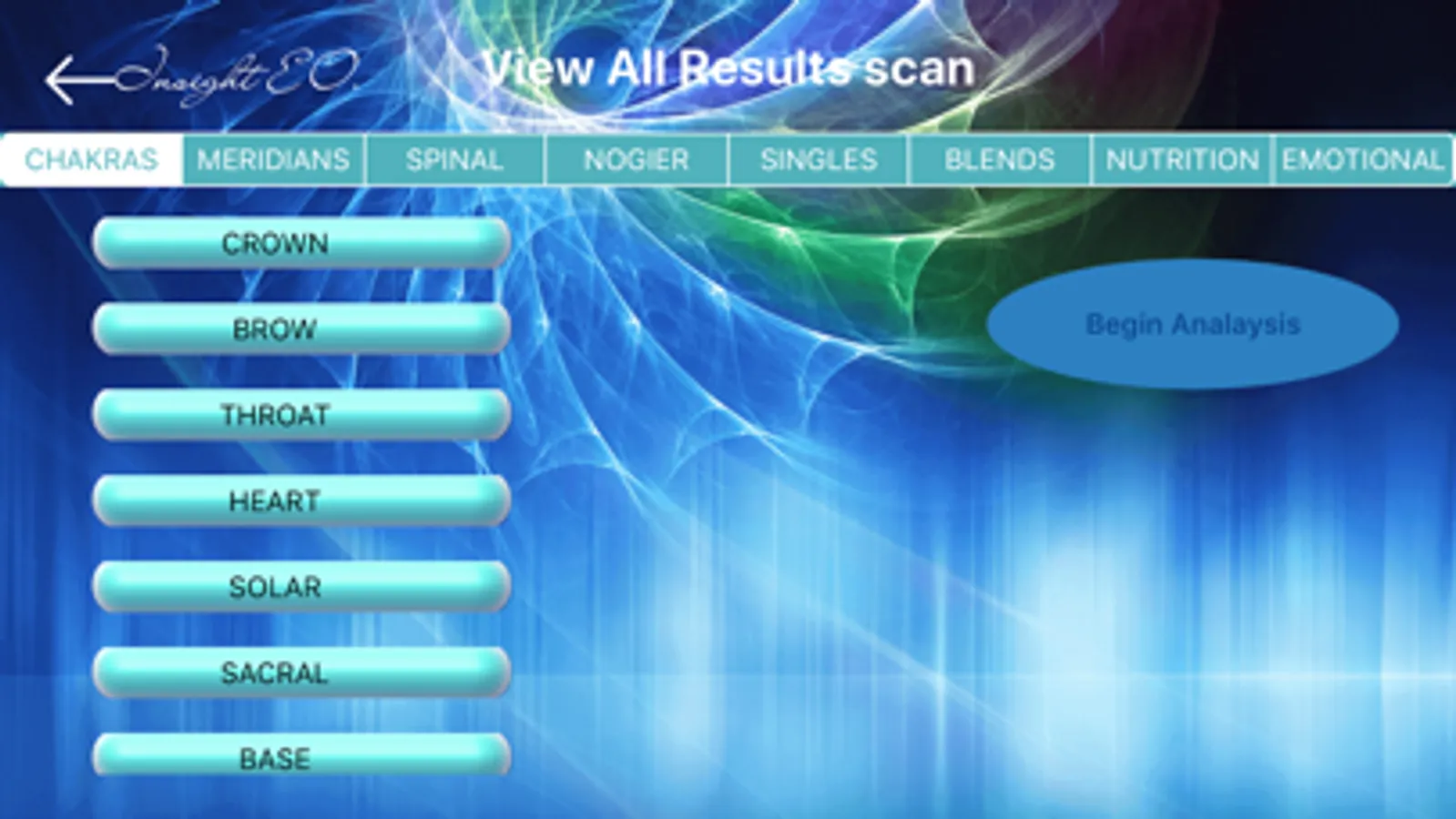 Insight Essential Oil app analyzes your voice using a process called Voice Spectral Analysis to determine energetic disturbances within your body. These energetic disturbances can be in the form of chakra or meridian imbalances or even spinal energy flow. Analyze these energetic disturbances and then see how the Young Living Oils may assist the body to heal and self regulate.