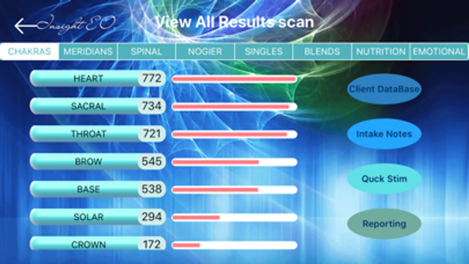 Get instant results of the full spectrum of Single and Combo Young Living Oil YLO essential oils. Also analyze the complete nutritional support of the Young Living Oils. All these items have been stored as a digital energetic signature. Use the Insight EO to not only analyze and find out which essential oils are best for you, but also access a database of energetic frequencies which when played helps the body to restore balance and harmony.