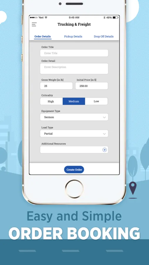 Customer can create an order by providing basic information regarding shipment, pickup and drop-o addresses.