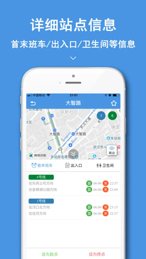 详细站点信息:站点首末班车时间,车站服务设施(卫生间和电梯等)、出入口信息等。