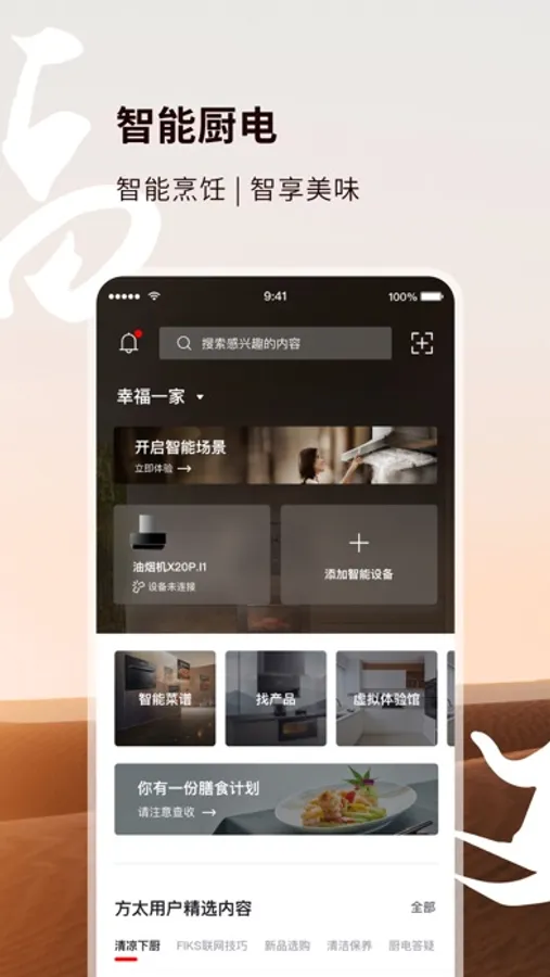 方太幸福家主打健康烹饪,站内里有10000多个方太专业美食菜谱,1100多个厨房攻略和烹饪技巧视频,无论是厨房小白入门,还是家庭大厨进阶,都能找到适合的美食教学,让用户发现美食的无限乐趣。