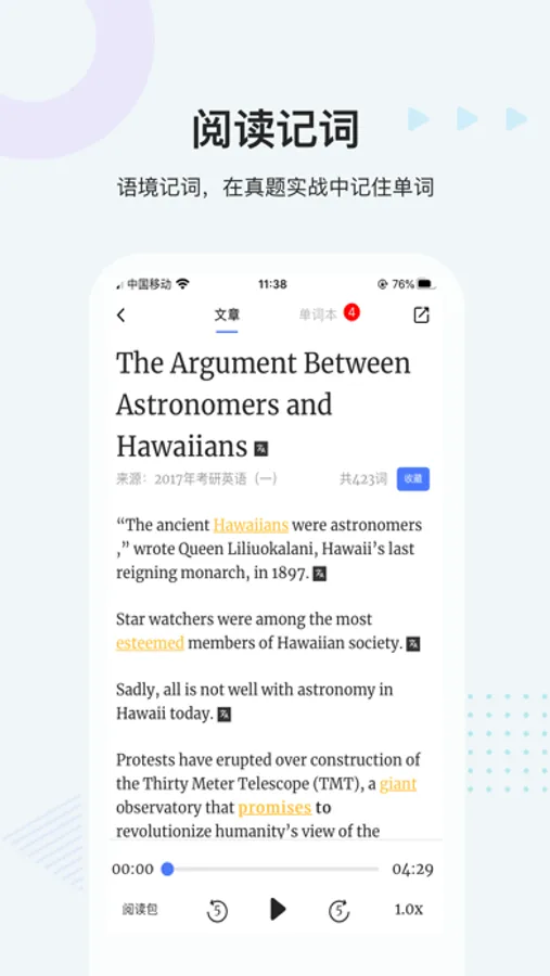 中公教育英语教学团队旗下背单词app,精心教研单词内容、先进学习方法、模拟考试阅读语境,还原卡片背单词场景,打造个性化单词卡片盒,学英语背单词从未如此容易!