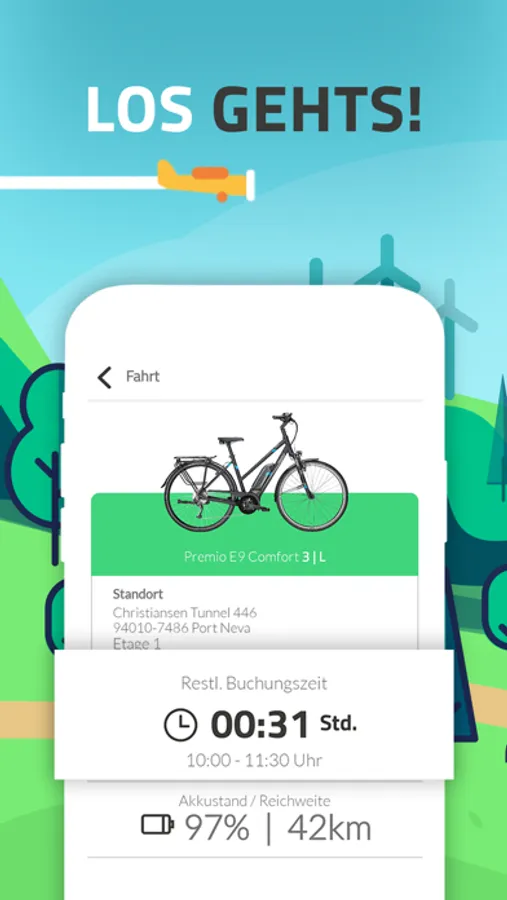 Um die Fahrt zu beenden, können Sie mit der App die Abstellanlage öffnen und das eBike an einen freien Platz stellen. Stecken Sie das Ladekabel in die Buchse am e-Bike und bestätigen Sie dies in der App. Ihre Fahrt kann nun beendet werden.