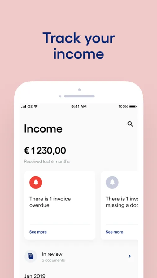 You’ll be able to see an overview of your income transactions, invoices and missing documents. Upcoming versions of the app will allow you to create invoices and send out reminders for them as well.