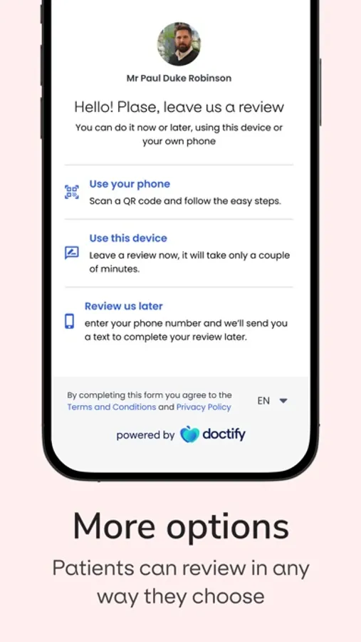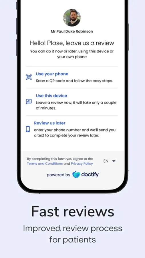 Doctify's third generation review collection application has been designed with an improved user experience to help patients leave meaningful feedback within a clinical setting.