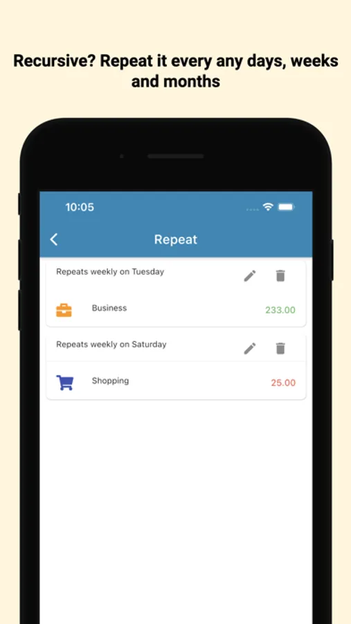 Recurring expense, such as subscription, utilities, mortgage, use Repeat. No need to type them. Supports income as well. It can be repeated by any days, weeks or months.