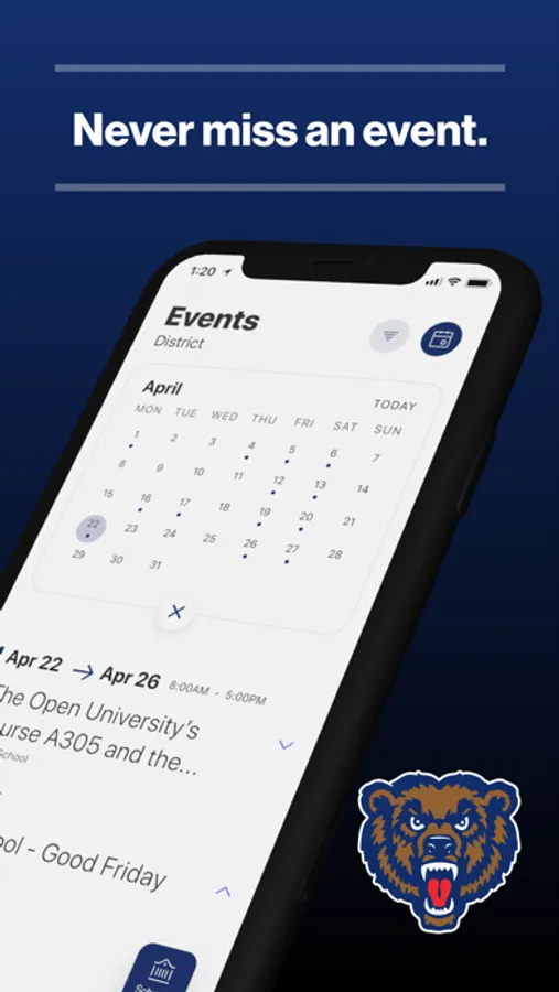 The event section shows a list of events throughout the district. Users can add an event to their calendar to share the event with friends and family with one tap.