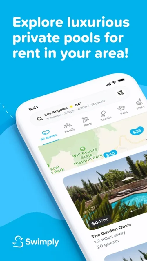Find and book your private experience by the hour with Swimply. Whether you're seeking a private space for a few laps, planning a memorable hangout with friends, or looking for quality family time by the pool (even with your furry friend if allowed by the host), Swimply has got you covered. You can search by category, location, price, group size, amenities, and so much more. Rent your private pool with Swimply today!