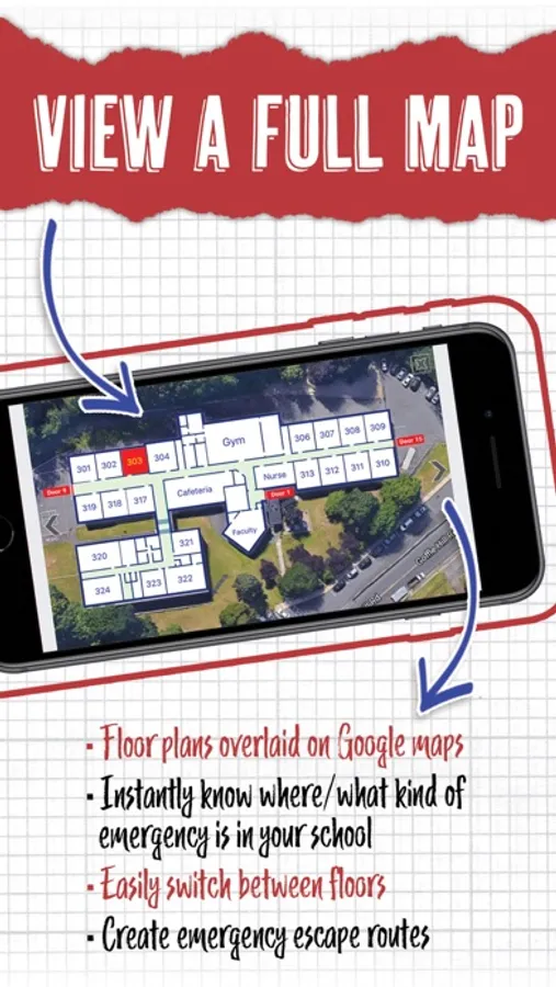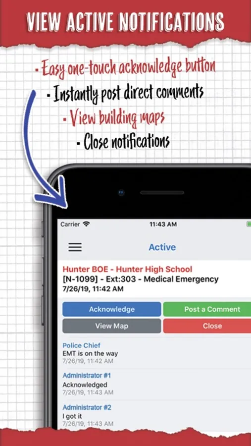Receive real-time emergency notifications from lockdowns to medical emergencies. Be able to view and leave comments for all personnel. Use the one-touch acknowledge button to inform the group you seen and reviewed the notification. Click the “View Map” to see floor plans of your school, get the visuals on the emergency, easily switch between floors, and see emergency escape routes.
