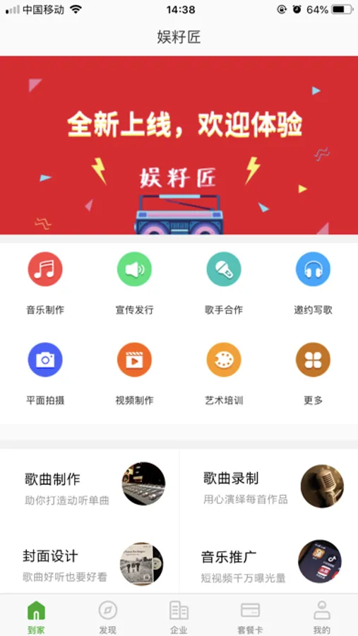 娱籽匠是一款综合的音乐类服务O2O应用,为潜力新星提供音乐制作、音乐推广、写真拍摄、MV制作等服务。