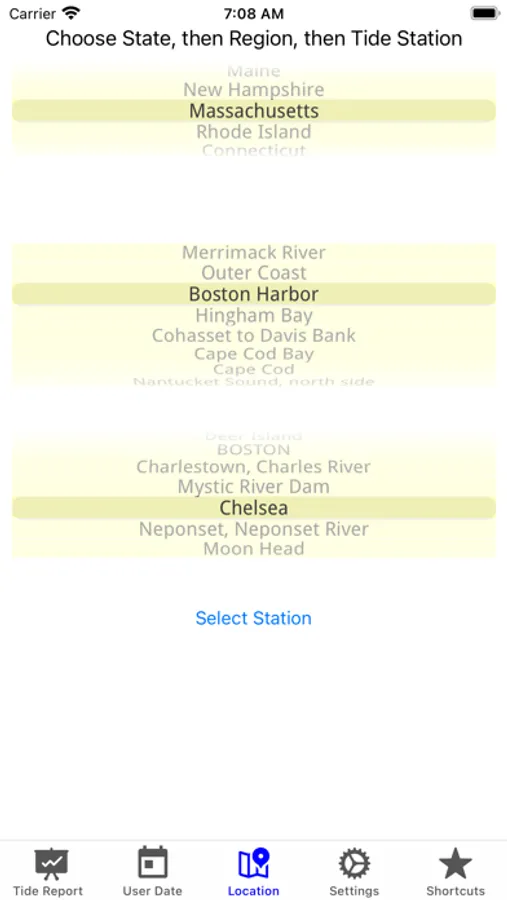 The Location Tab allows you to specify which location you want the tides for. There are three scrolling wheels, top to bottom. The top one chooses a state. When you have chosen a state the next scroll wheel will show you the regions within that state. When you have selected a region the next scroll wheel allows you to choose your desired tide station. When all the state, region, and stations highlighted choices are what you want, then just choose the Tide Report tab and you will get a tide report for that location.