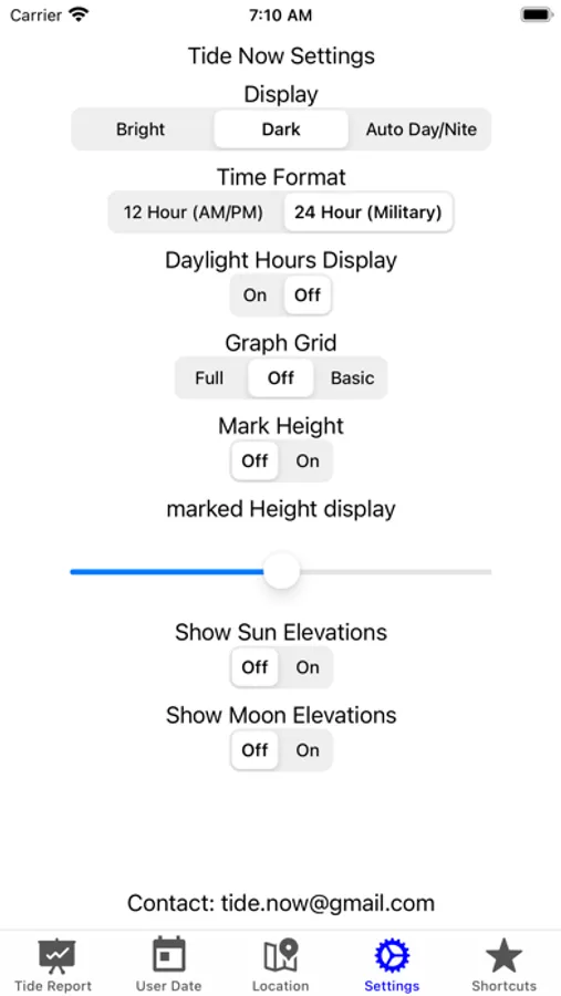 The Settings tab lets you choose how the Display looks- Bright, Dark, or Auto Day/Nite. It lets you choose a time format - AM/PM or military. It lets you turn on or off a highlighted Daylight Hours Display - an area on the tide graph. Finally, it allows you to turn on or off the Graph Gride. These settings are to allow you to control how detailed of a graph you want to see.