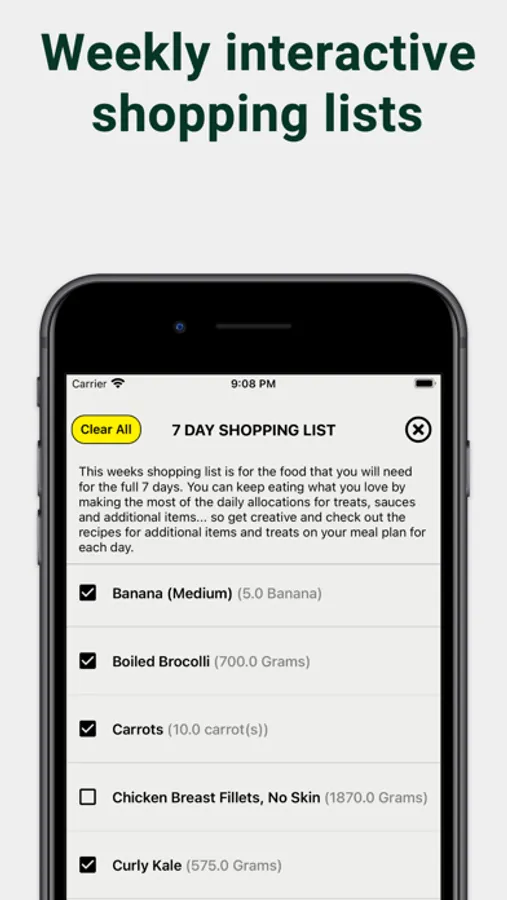 Stay organized with a weekly shopping list that guides you on what to buy.