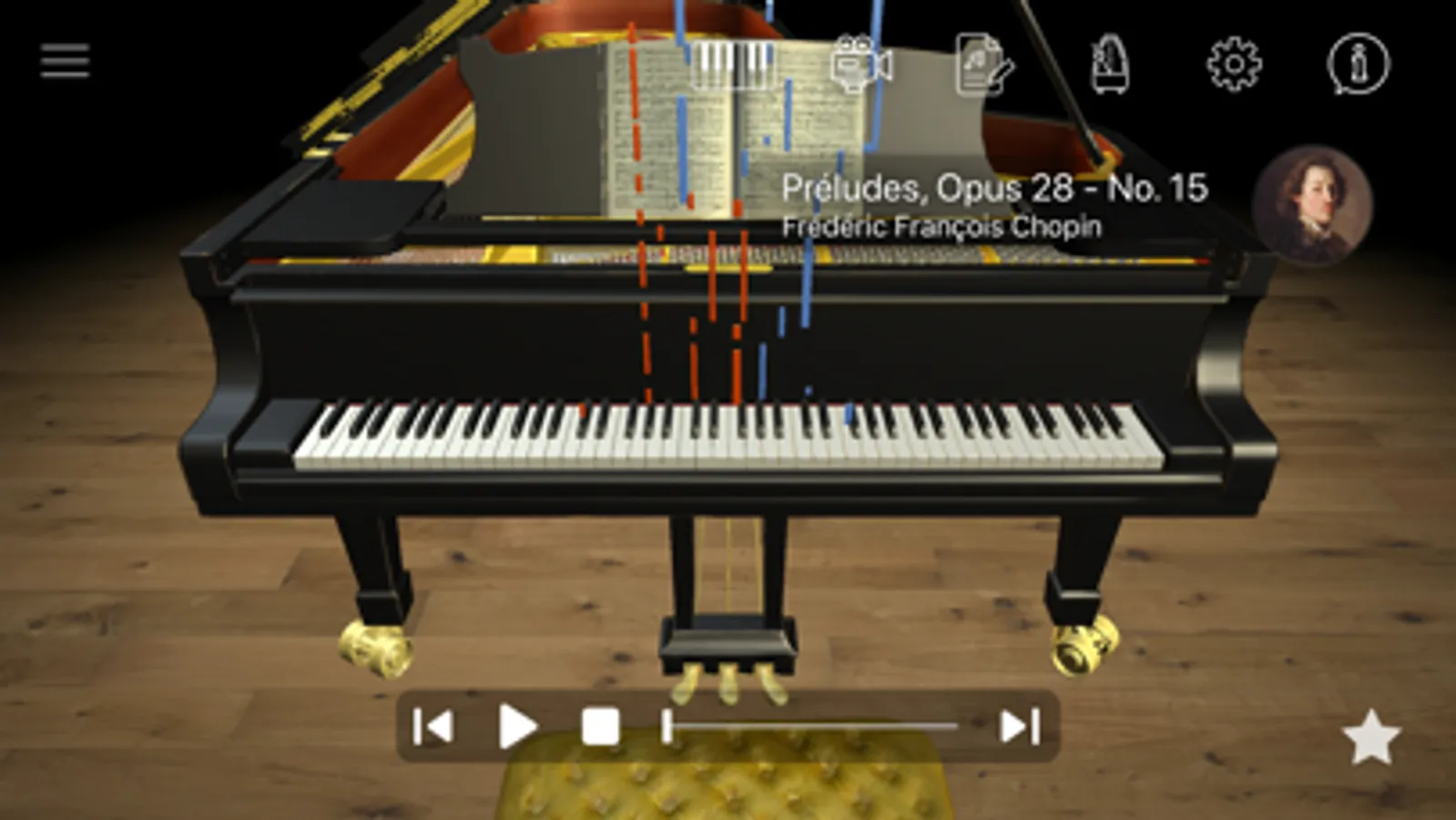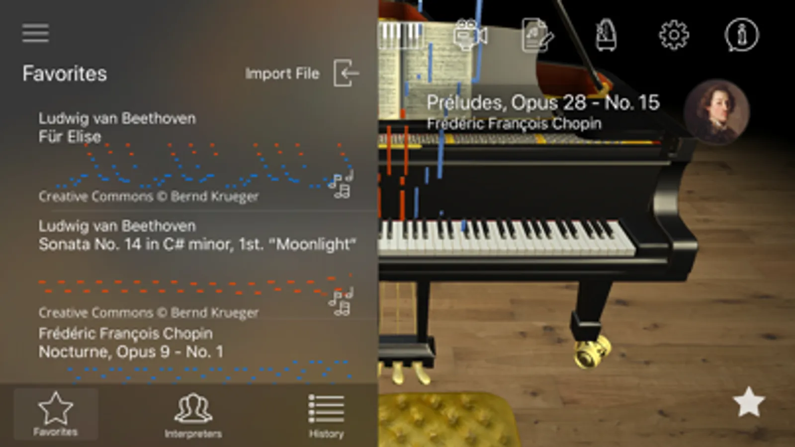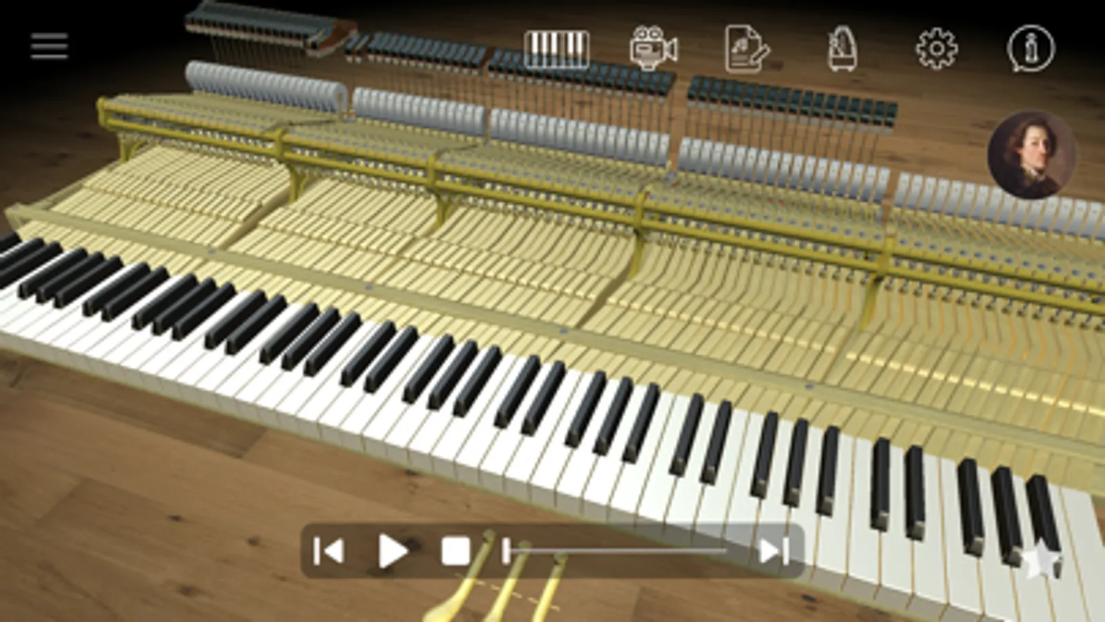 - Pedals can be activated (sustain, sostenuto, soft pedal)