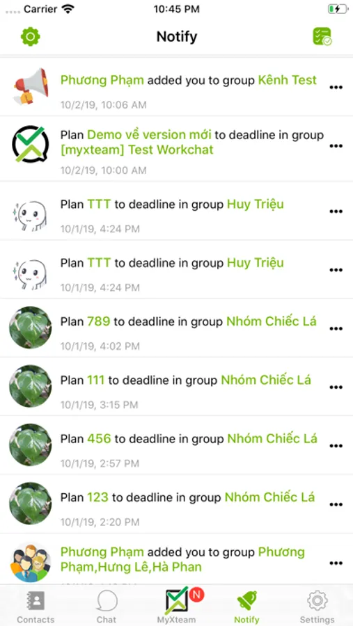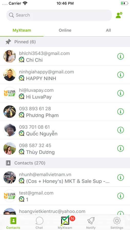 - Chức năng danh bạ, tích hợp với danh bạ trên điện thoại ( nếu user chọn) nhằm dễ dàng mời tham gia myxteam và hiển thị tên thực từ danh bạ