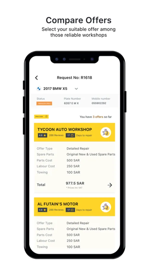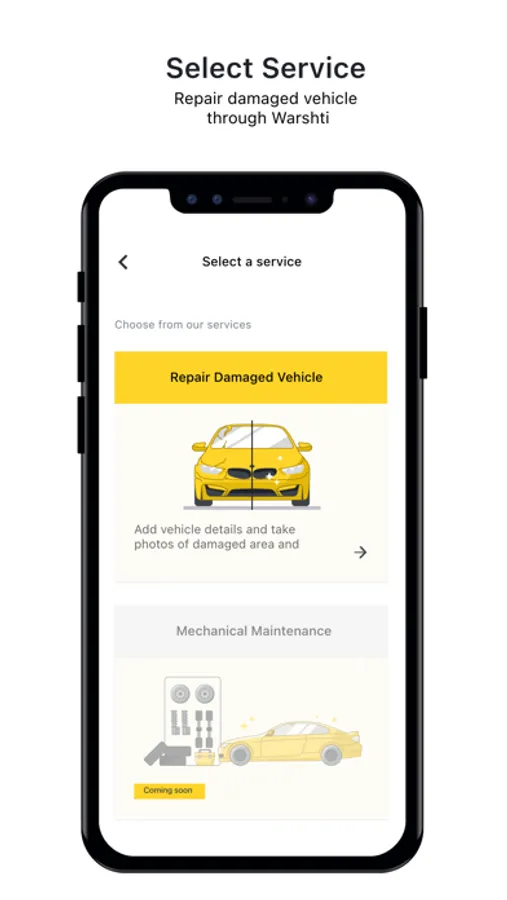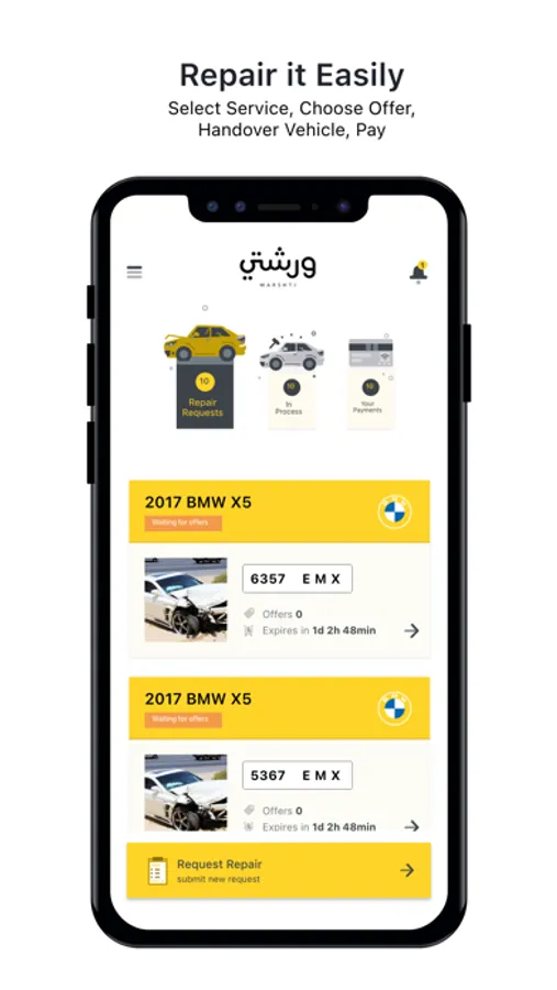 Repair the damaged vehicles by requesting a repair service, get the best offers from guaranteed workshops, and sending the vehicle to the workshop and returning it using Warshti App.