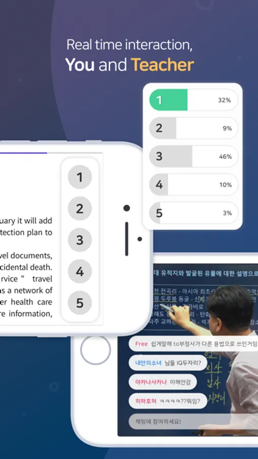 You can join real-time lectures from anywhere and anytime up to your schedule. In schools and academies, students just listen to lectures without any chance to respond and interact. With "Talkkang", you can listen while sharing your opinion, immediately ask your questions, chitchat with participants, see students’ responses and quiz performances in real-time.