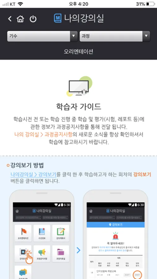 해당 어플은 교육원의 LMS 학습 전용 어플이며, 마이페이지에서 국비지원 과정과 일반과정을 학습할 수 있습니다.