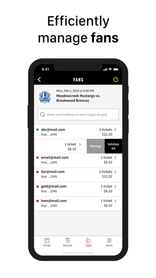 • Easily view all fans transactions to manage tickets or resend receipts.