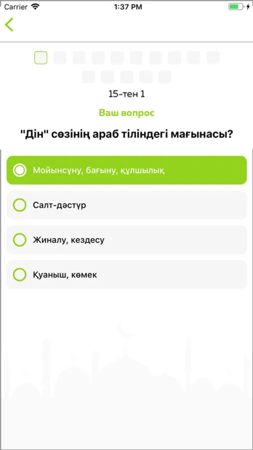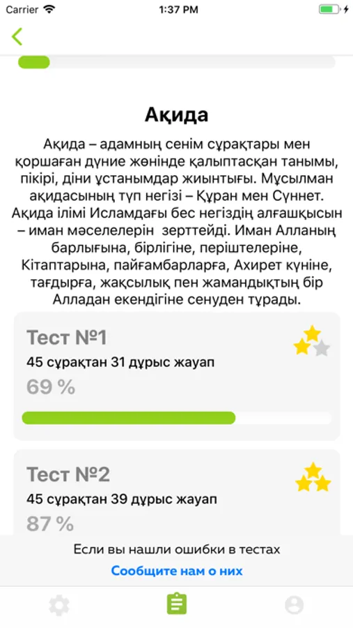 "ISLAMTEST" қосымшасы Исламның тіректері болған Ақида, Фиқһ, Сира, Сахаба және Құран тақырыптарын қамтиды.
