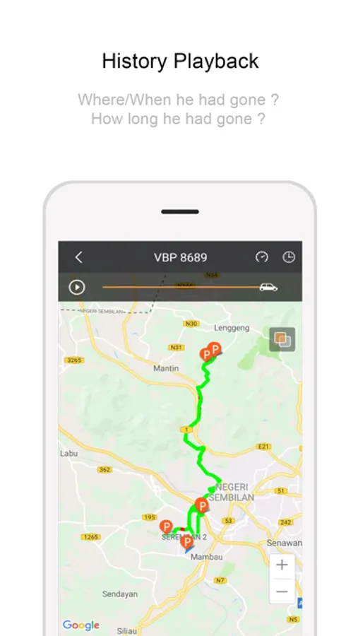 3.History Playback: lets users quickly check where vehicle was at any given time or over a particular time frame.