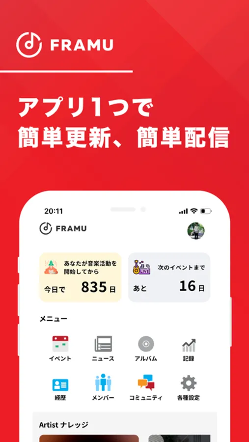 ライブの予約管理や告知、音源配信などあらゆる事務作業をFRAMUでまとめて管理できます。