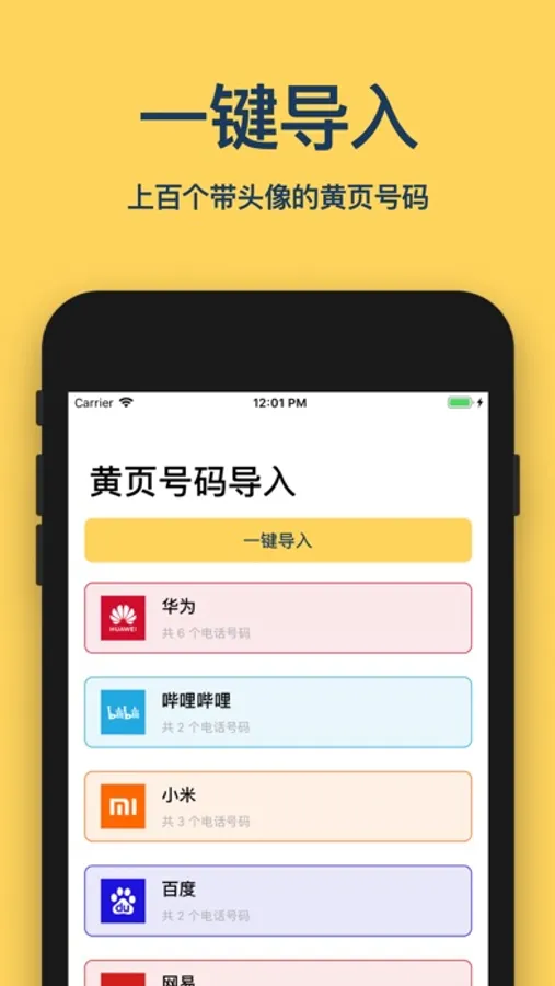 小黄页 is a tool that can import hundreds of leading image enterprise service numbers into the address book at one click. It can also manage the group of the address book conveniently on the mobile phone without the iCloud operation on the computer.