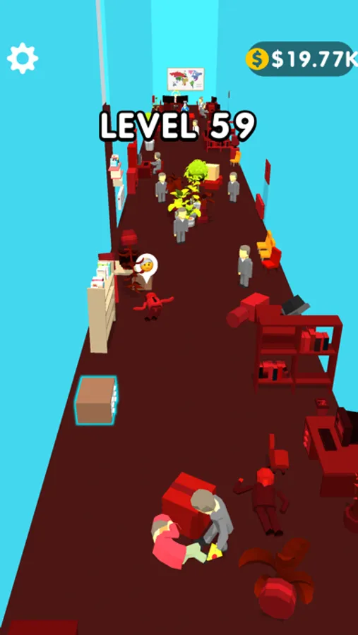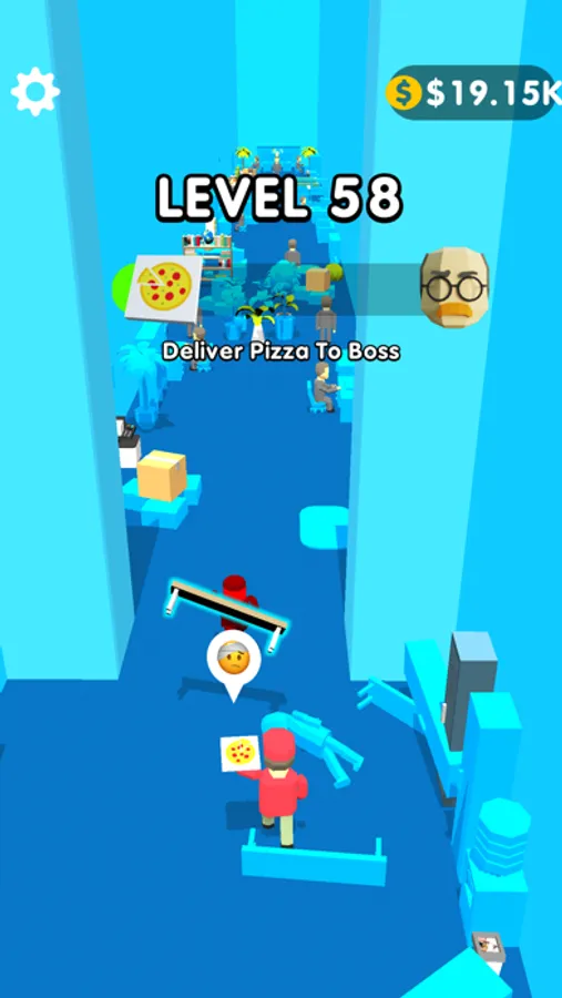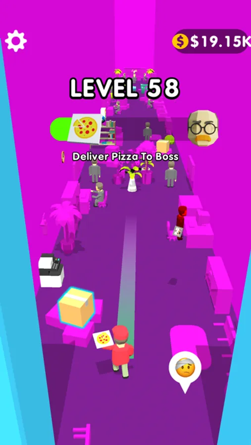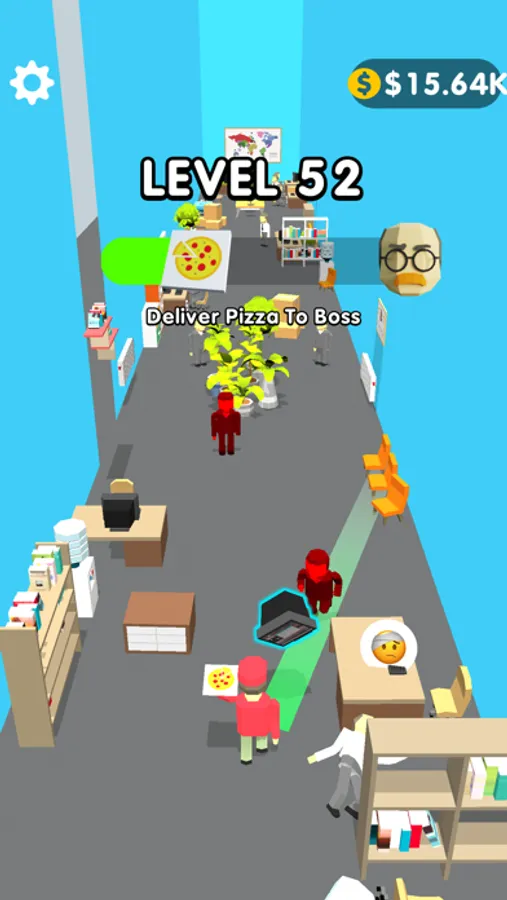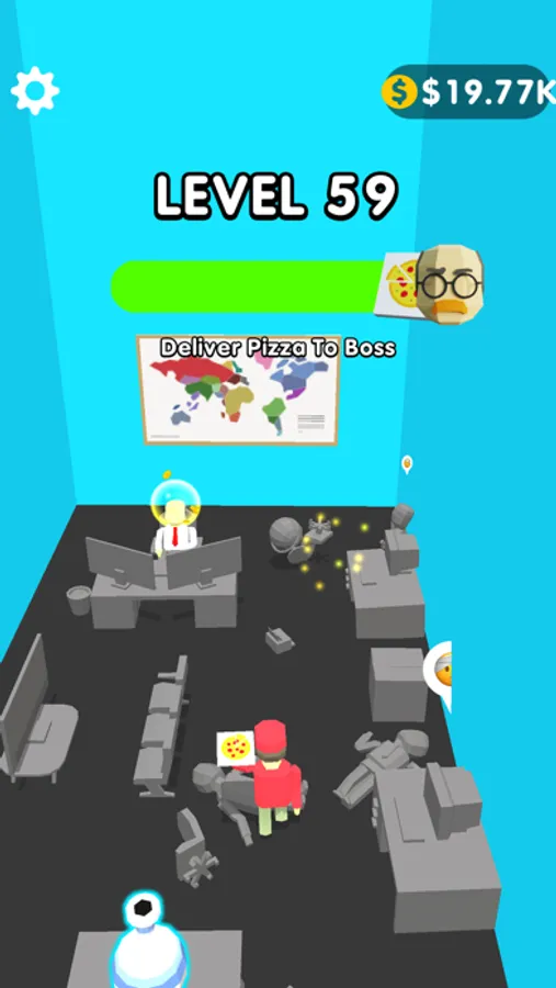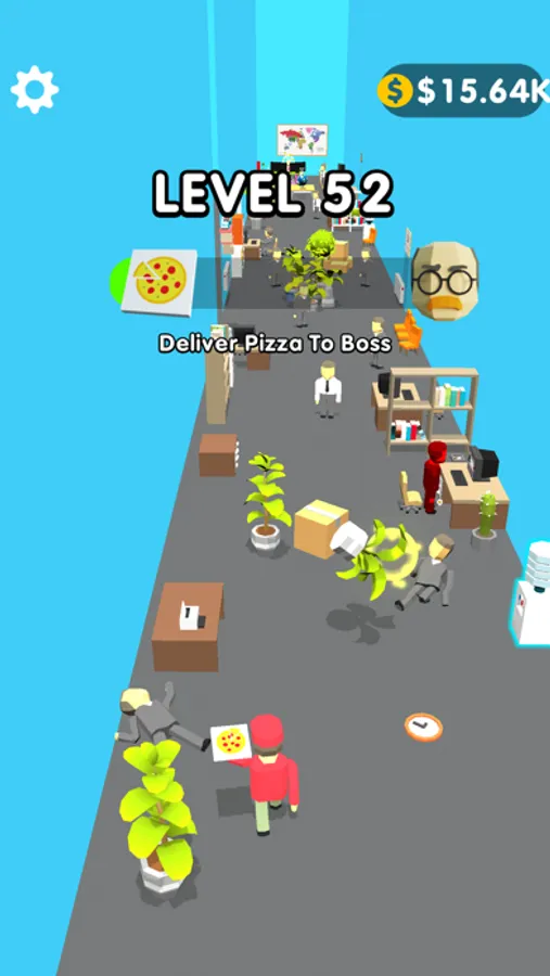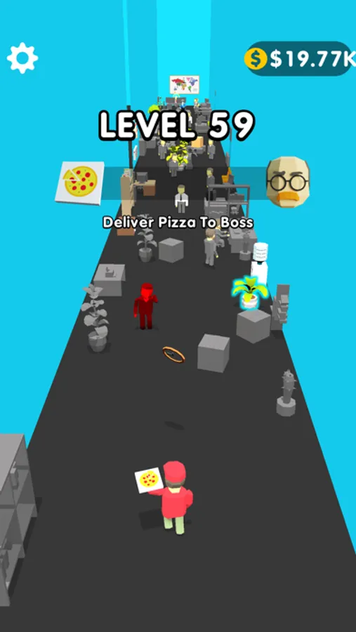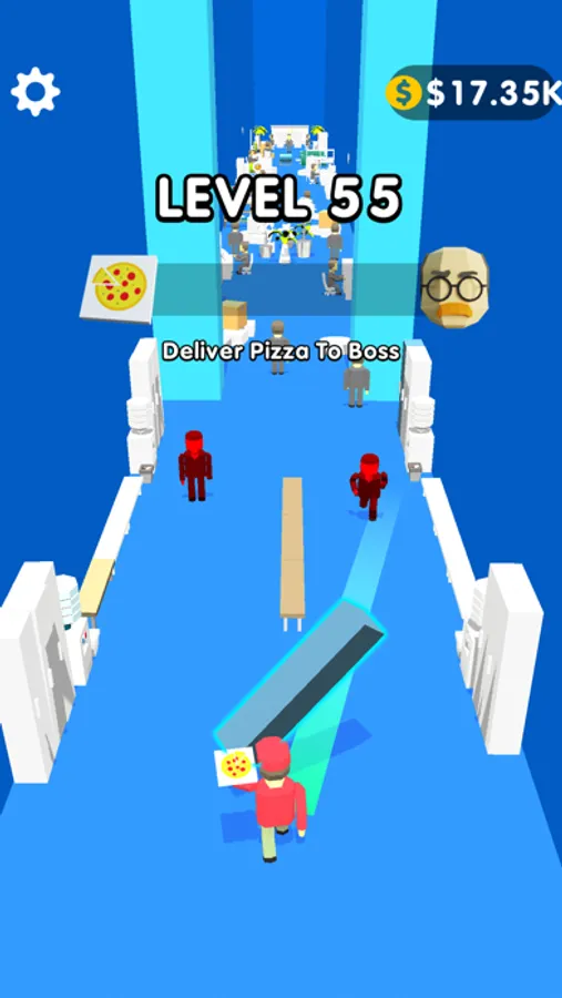 You are a pizza deliverer man, who just want to do his work and run through the office to his delivery point. But angry and hungry workers want to beat him and eat his pizza!