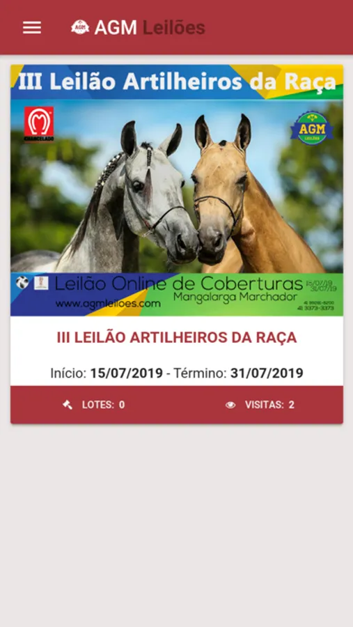 A AGM Leilões, visando se aproximar ainda mais de seus clientes, amigos e parceiros, acaba de lançar seu aplicativo de Leilões e Vendas. Por meio do aplicativo, ficou muito mais fácil ficar por dentro das novidades, conferir os lotes de forma muito mais fácil, poder curtir seu lote favorito, enviar mensagens diretamente para a AGM Leilões e garantir uma compra de alta qualidade!