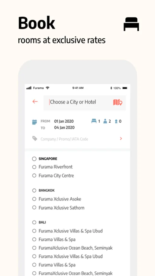 Based in Singapore, Furama Hotels International (FHI) is an award-winning chain of hotels with over 40 hotels, resorts and villas to cater to the guests in Asia Pacific region - Australia, China, Indonesia, Malaysia, Singapore, Taiwan and Thailand. With over 7,000 rooms and 3 brands (Furama, FuramaXclusive and FX), the Furama app allows you to book hotels and also access the benefits wherever you are, at the tip of your mobile device.