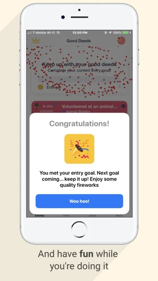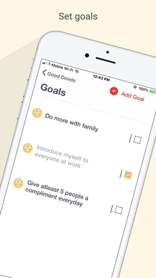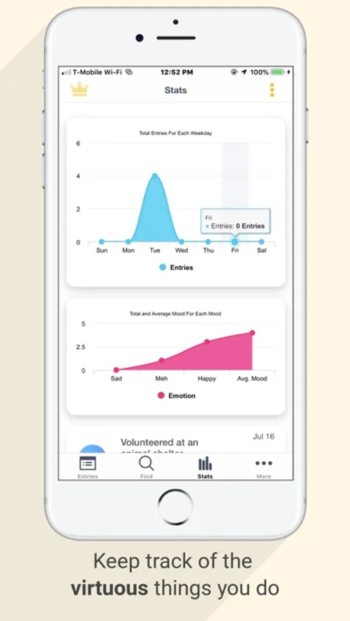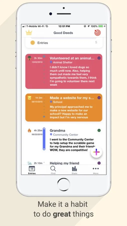 - Statistics: track and monitor your good deeds; keep up long streaks to show that you've been doing something great everyday.