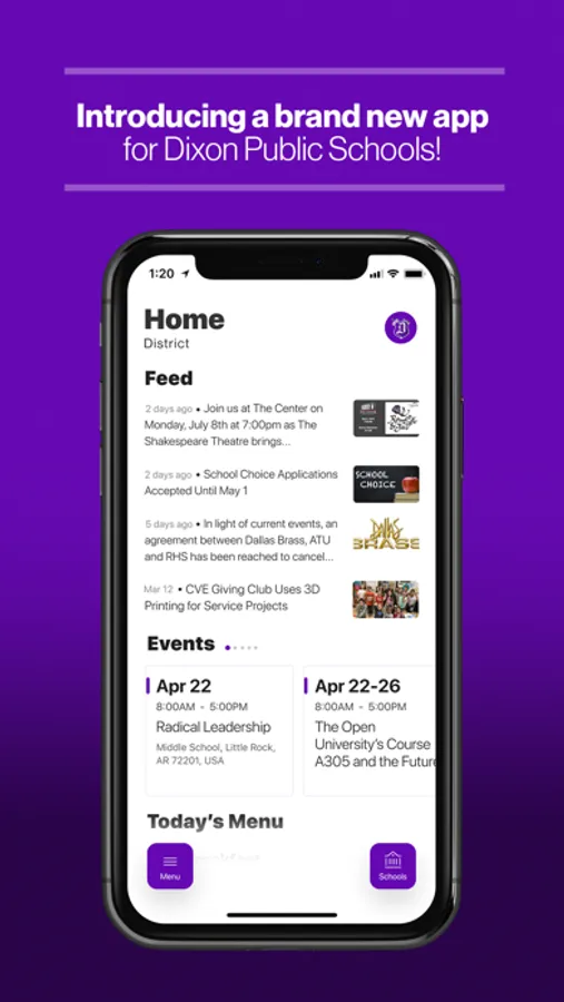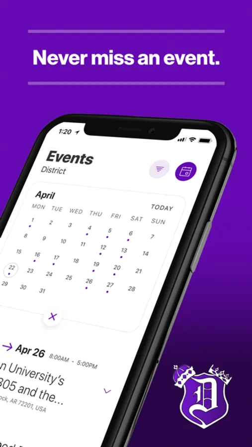 The event section shows a list of events throughout the district. Users can add an event to their calendar to share the event with friends and family with one tap.