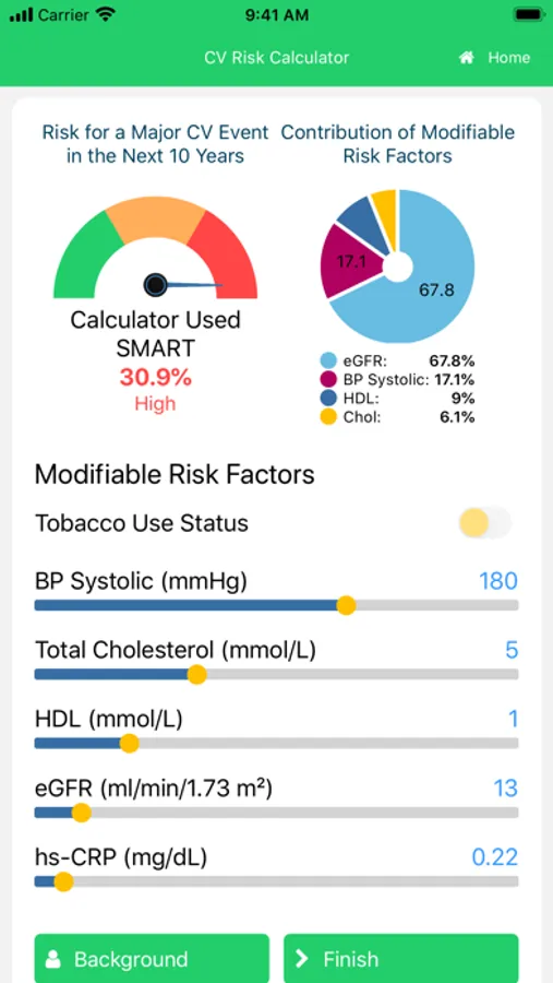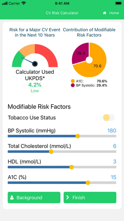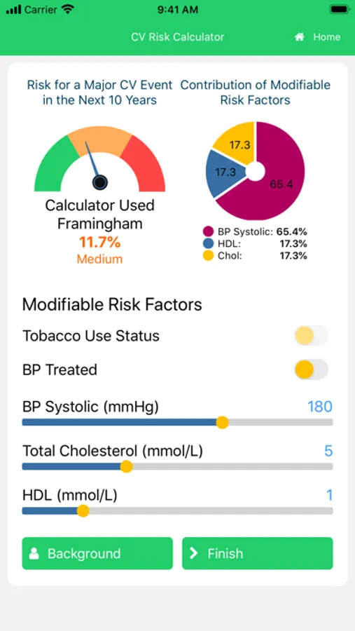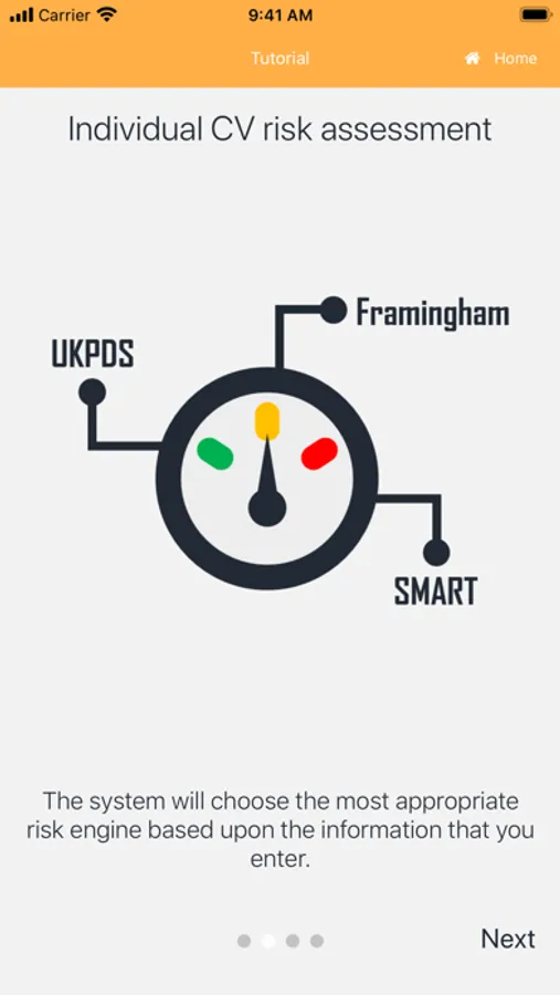 This calculator is intended as a tool to assess cardiovascular risk and engage patients in managing their risk factors. It uses 4 different risk engines depending on the patient's medical history i.e. if he/she has diabetes, vascular disease, chronic kidney disease or none of those conditions. In the case where more than 1 risk engine could be used (e.g., patient has diabetes and vascular disease), the system will default to using the risk engine generating the highest risk.
