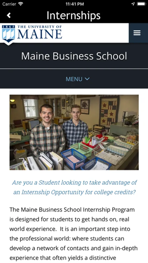 This App was made for Maine Business School students at the University of Maine. The app provides info on how to contact the school, find internships, advising, and connect with our social media platforms.