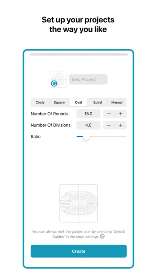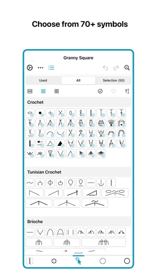 Use the initial setup to place guides in a circle, rectangle, oval or spiral. Choose from 70+ symbols including Brioche and Tunisian Crochet.