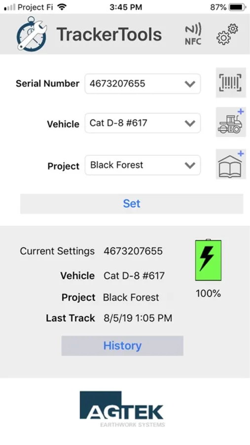 A support utility for AGTEK's latest track sensor, Tracker tools manages tracker and machine assignments to your projects. Scan the bar code, NFC tag, or pick from a list and instantly change what machine is being tracked or what project it is on. The history feature shows the current settings, battery status and allows editing of past tracks and machine assignments.