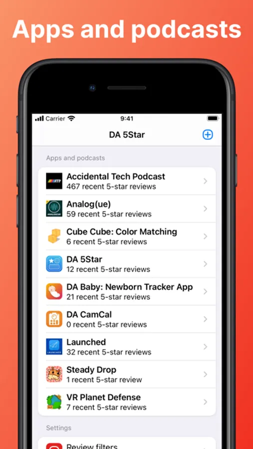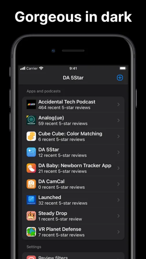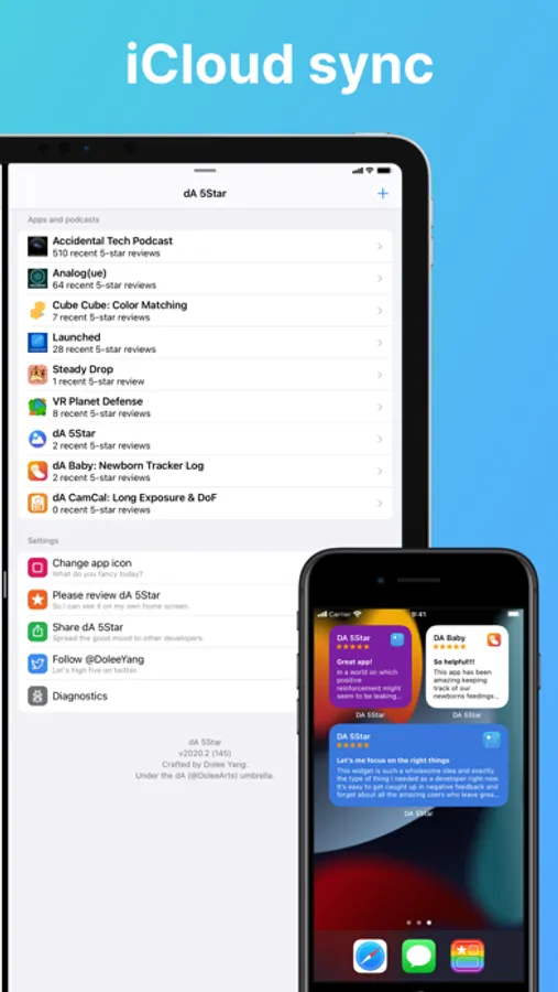 Mango 5Star is a home screen widget app built for you. It displays *only* 5-star reviews of your app or podcast on Apple platforms.