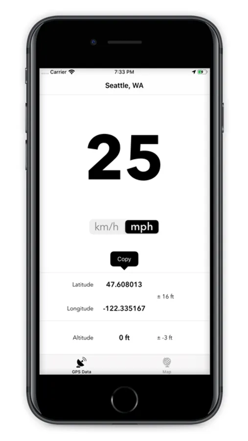 The app also shows current altitude, GPS Coordinates (latitude and longitude) and vertical / horizontal accuracy.
