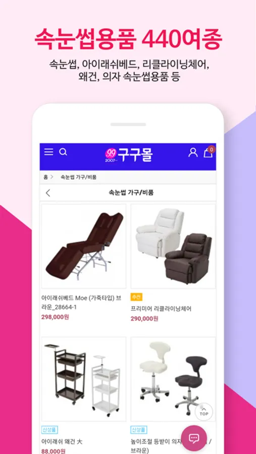 속눈썹 258종, 속눈썹용품 87종, 속눈썹 침대 46종 (아이래쉬, 접이식), 리클라이닝의자 4종, 의자 45종