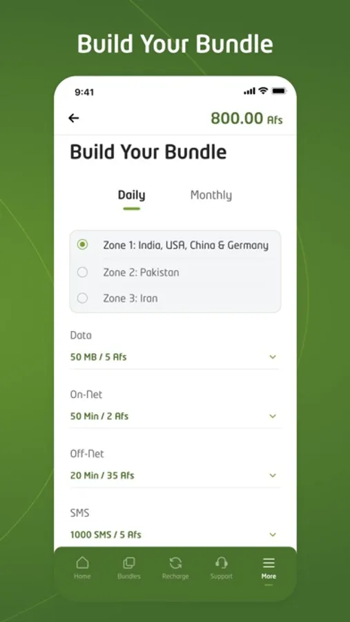 • Build your bundle: customize your bundles and choose from daily and monthly data bundles, OnNet voice bundles, OffNet call bundles, SMS bundles, and international bundles.