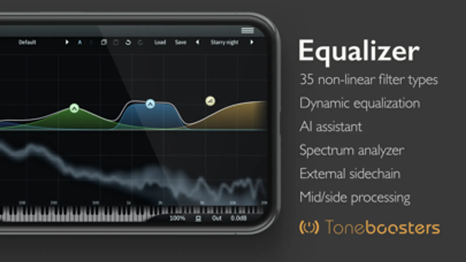 ToneBoosters Equalizer is a top-quality, professional, dynamic equalizer AUv3 / IAA plug-in with an unrivalled workflow, warm, non-linear filters and a gorgeous, functional user interface.