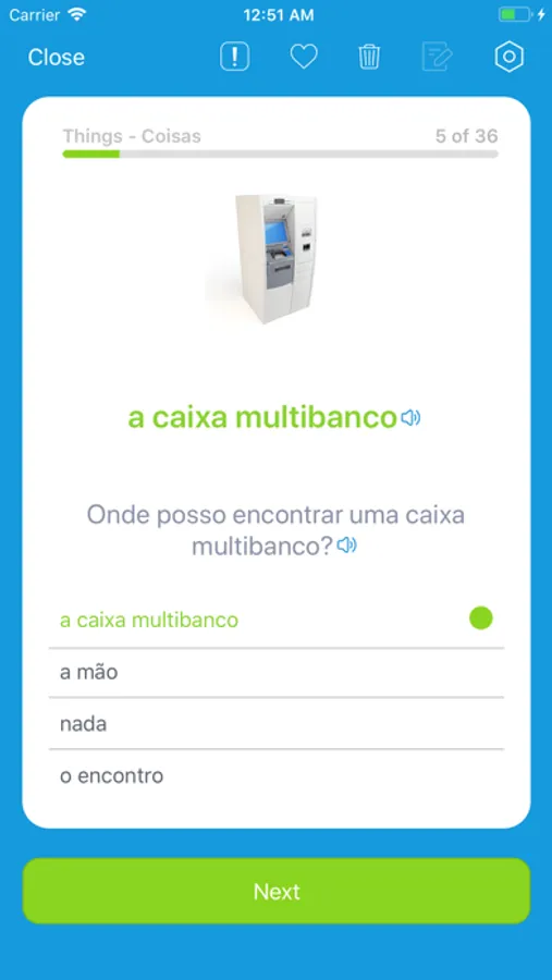 Flashcards are constantly rising in popularity, due to the fact that they combine entertainment with learning. If you aim to know and speak Portuguese fluently, for studies, work or in order to impress native speakers with your knowledge during the next trip - this app is perfect for you!