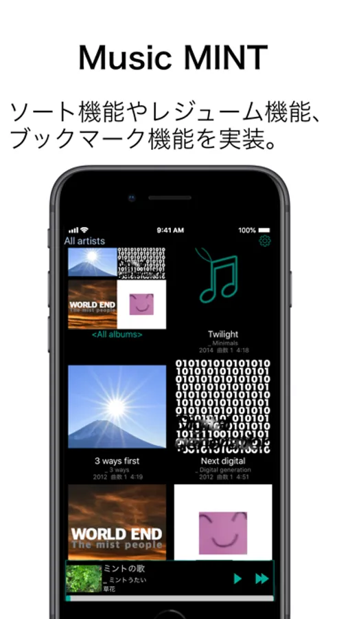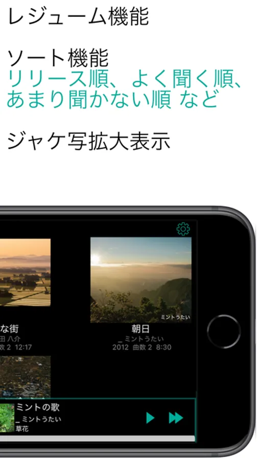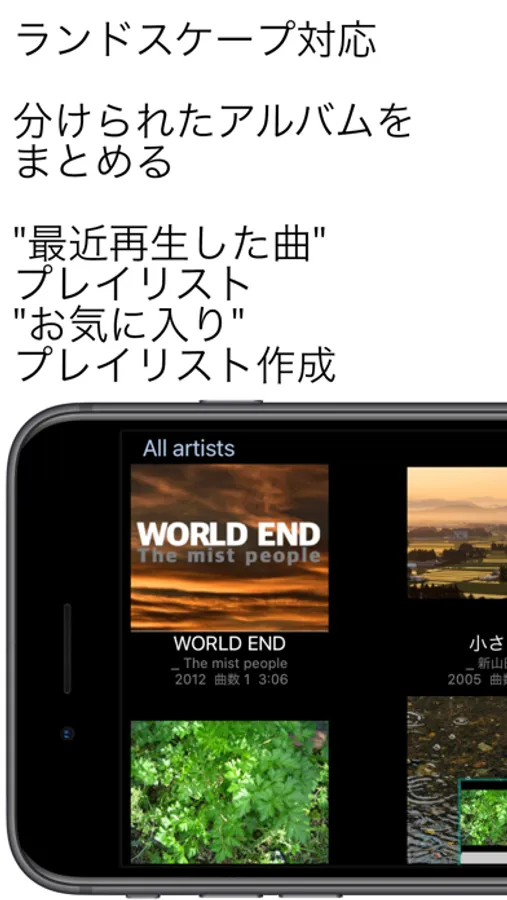 同期されたiPhone,iPad内の曲を再生します。DRM付きの曲は再生できません。装飾をなるだけ排除した画面で一覧性を向上しています。