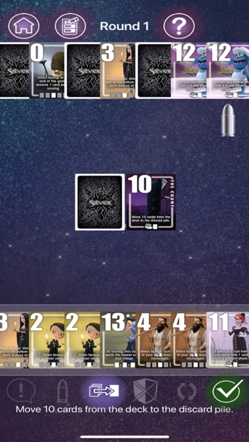 Your goal in Silver is simple: have the lowest sum by the end of four rounds. To accomplish this, use abilities from the cards you draw, and from cards that are already face up in your village, which consists of five cards. You can trade in matching cards, and also trade out your cards for ones you draw to make matches or to lower your score. End a round early if you think you have the lowest sum by calling for a vote; if you’re right, you score 0 points, and get to use the Silver Amulet of Protection the next round. If you're wrong, though you get the sum of your cards plus ten points!