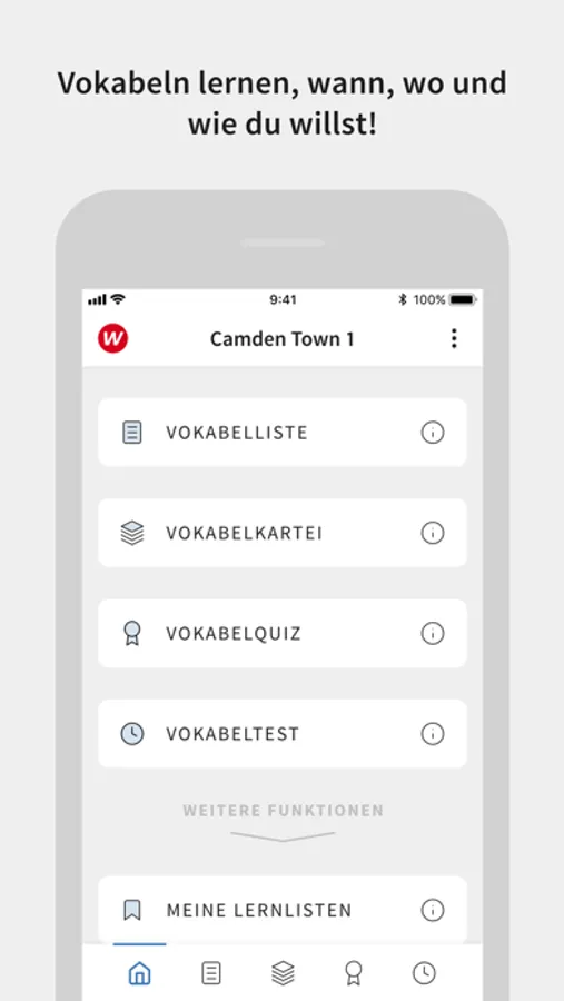 • Lerne auch deine eigenen Lernlisten mit der Vokabelkartei, dem Vokabelquiz und dem Vokabeltest.
