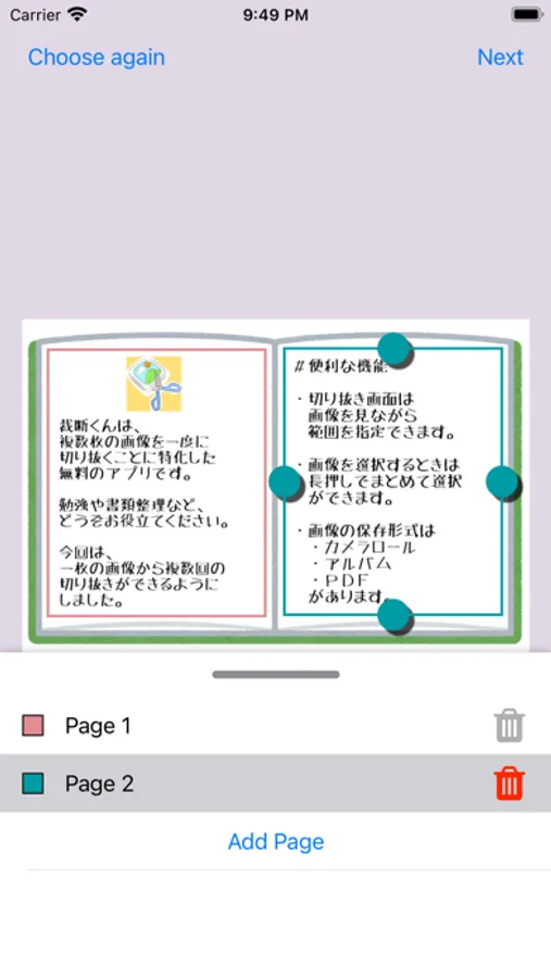 - You can increase the trimming area up to four, making image or page segmentation easier. The order of cropping can also be easily identified by color.