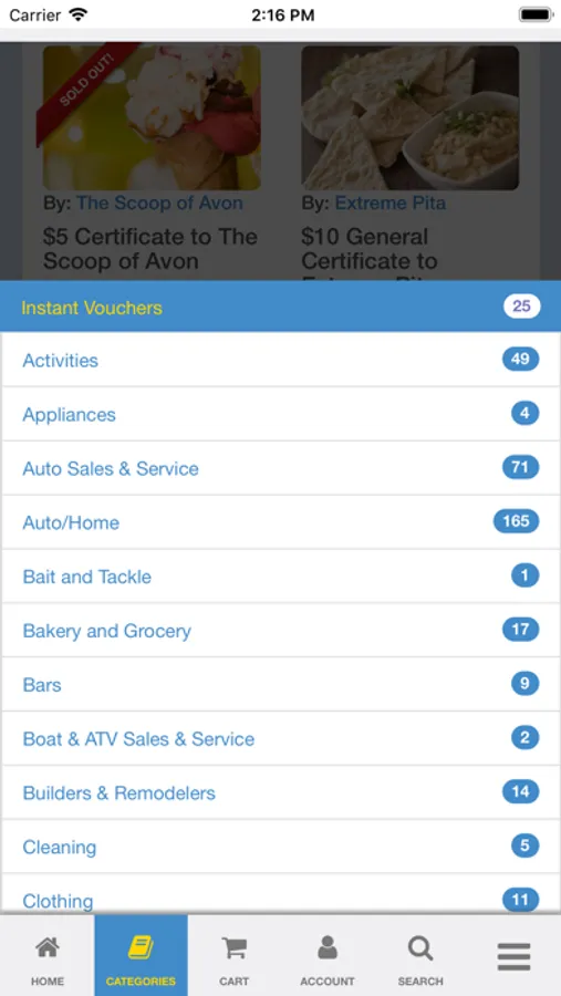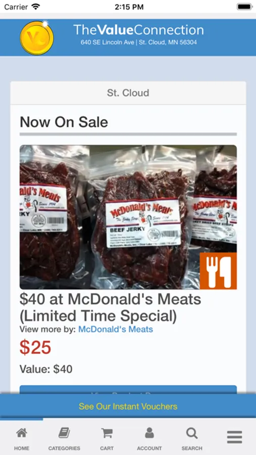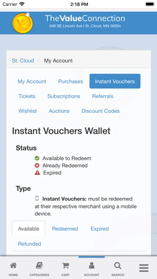 The Value Connection also offers some deals as “Instant Vouchers”. After purchased, an “Instant Voucher” will show up available to redeem under your account in the “Instant Voucher” tab. Once you’re at the business, you’ll redeem via your phone. Then present the redeemed “Instant Voucher” screen to the business.