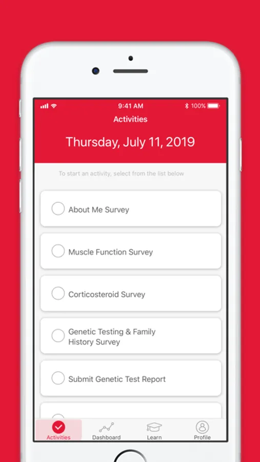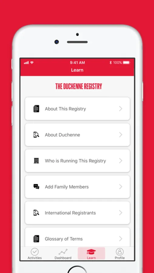 To better understand your health and your daily experience living with Duchenne/Becker, we will ask you to respond to several surveys. If you are a previous Duchenne Registry participant, your most recent survey data will pre-populate when you download the new app. We will also ask you to share a copy of your genetic test report. You can decide how much information you wish to share. However, the more data we have, the more we can share with researchers and the better we can tailor information to your specific needs.