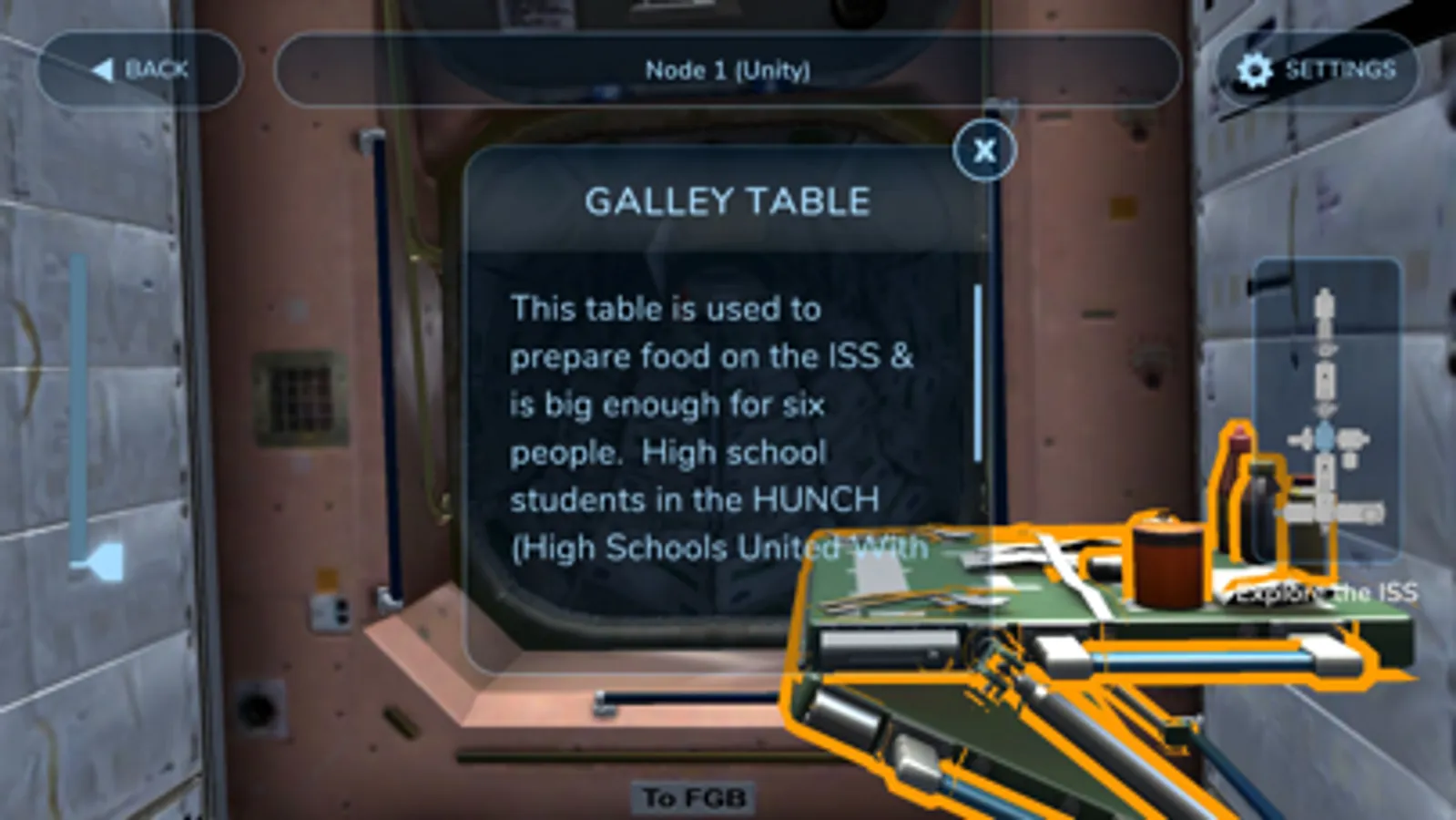 Using Simultaneous Localization & Mapping (SLAM) augmented reality technology, the user will be able to place a realistic 3D model of the International Space Station on any nearby surface in their reality. By moving the device around in the AR Mode, the user can observe the exterior of the ISS in detail, including the information about each module. Go inside the 3D interior to experience the point of view of the astronauts themselves. Approach each apparatus inside the station to watch helpful videos and know more about it. Via the mini map available, the user will also able to jump to different modules.