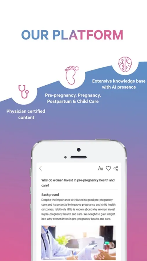 Pre-Pregnancy – Our app advises aspiring mothers on the best practices to increase the chances of successful conception. This also includes information on in-vitro fertilization (IVF), guidance on contraception, and tips to connect with your loved one.